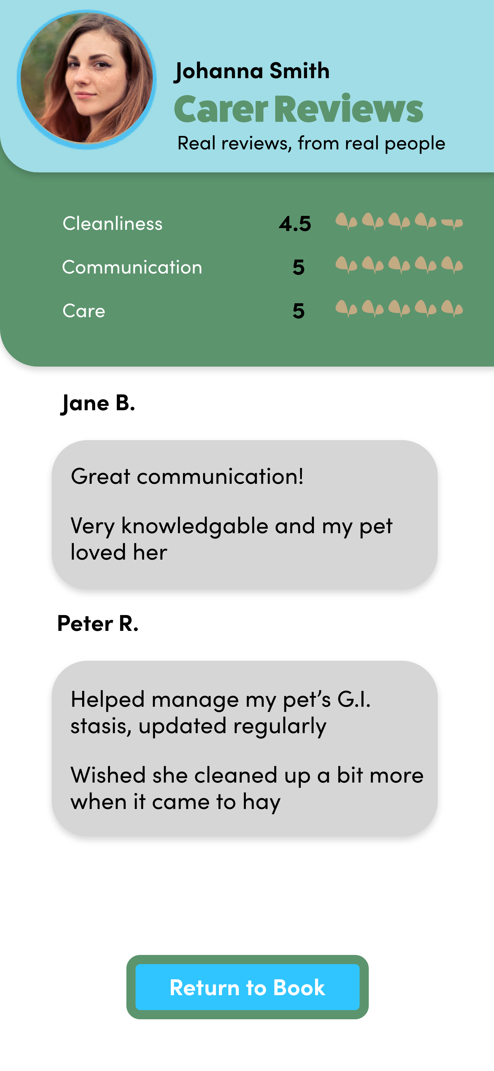 To increase trust, I wanted to add a review page and a verified button for those who have received background checks. This is especially important for house sitters so that users can trust a potential pet sitter. Potential sitters would also be required to explain their experience and what services that they can render.