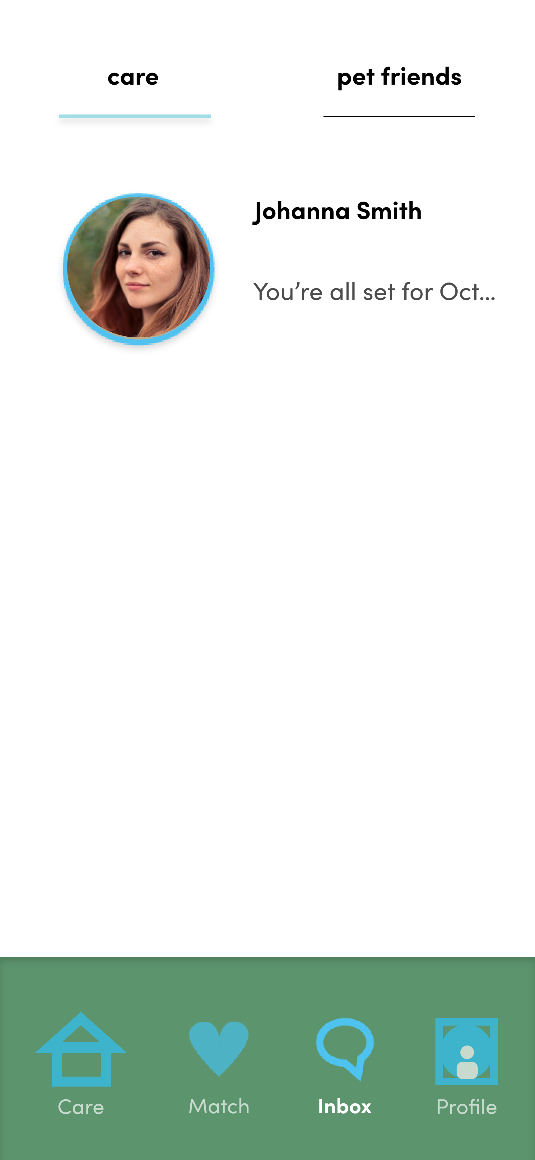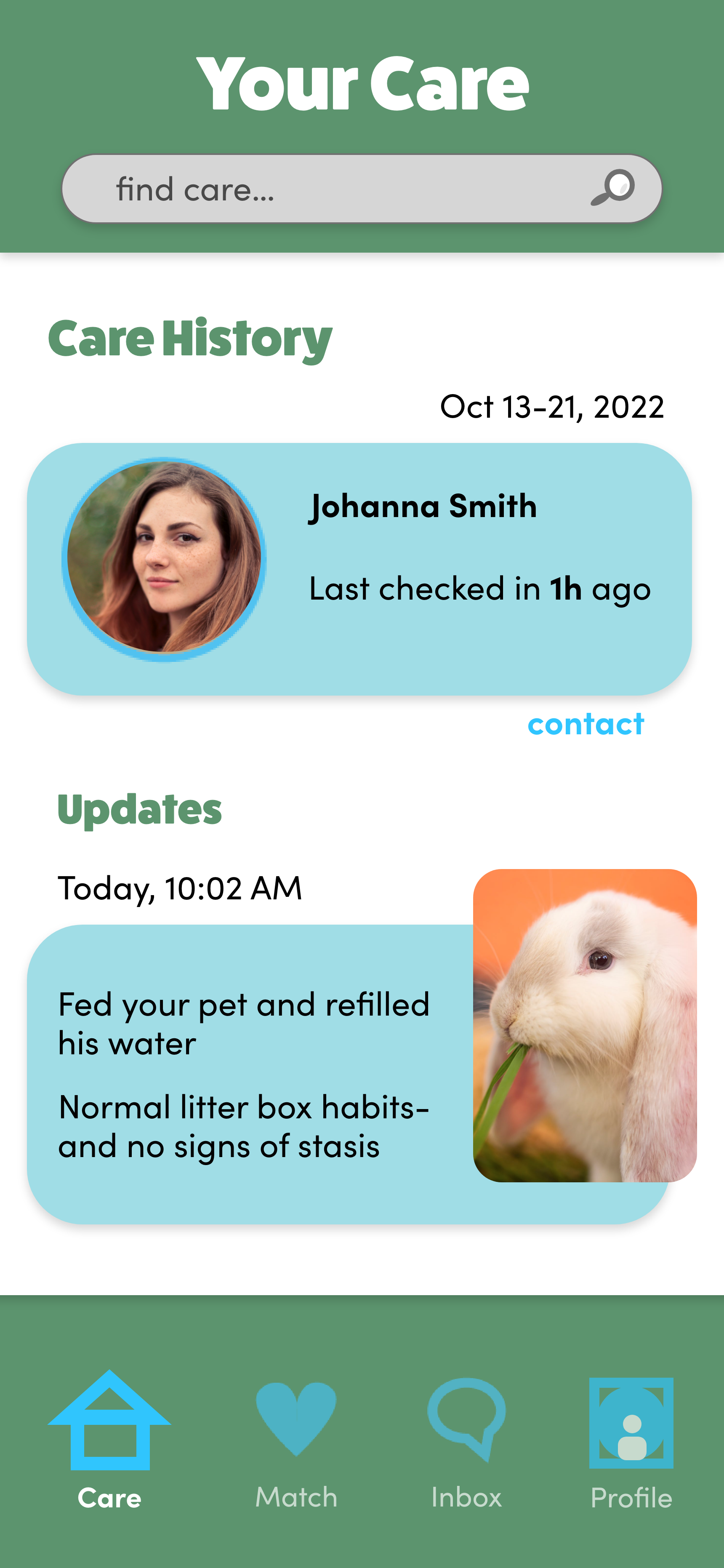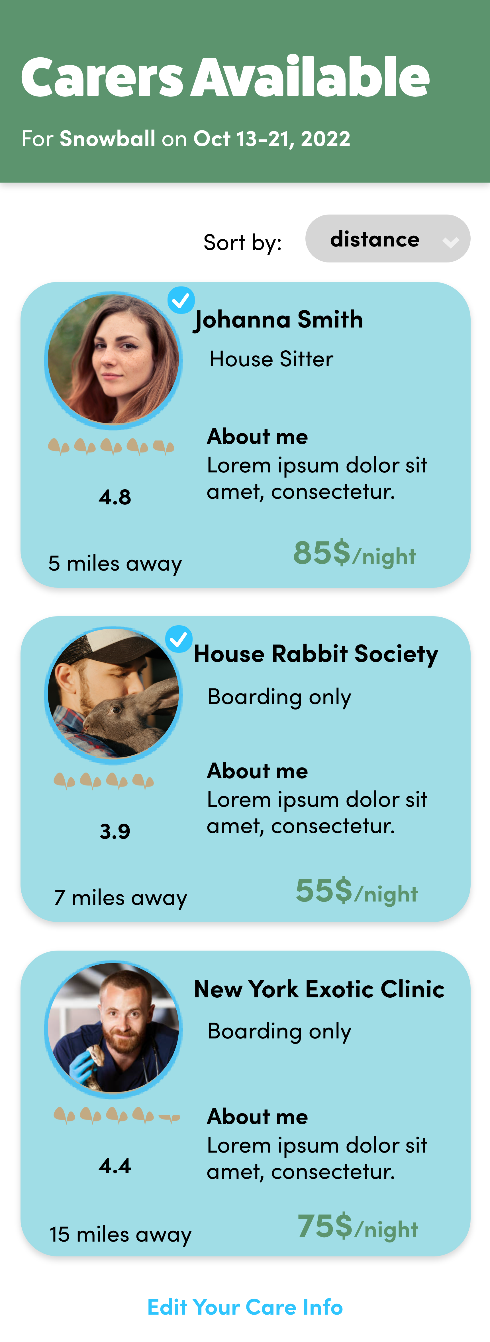 If I had more time, I would have liked to build a more detailed and structured Care Plan interface that would help guide the user into creating a detailed and expansive guide for potential carers. I would have also liked to make the interface for matching pet owners more personable and customizable.