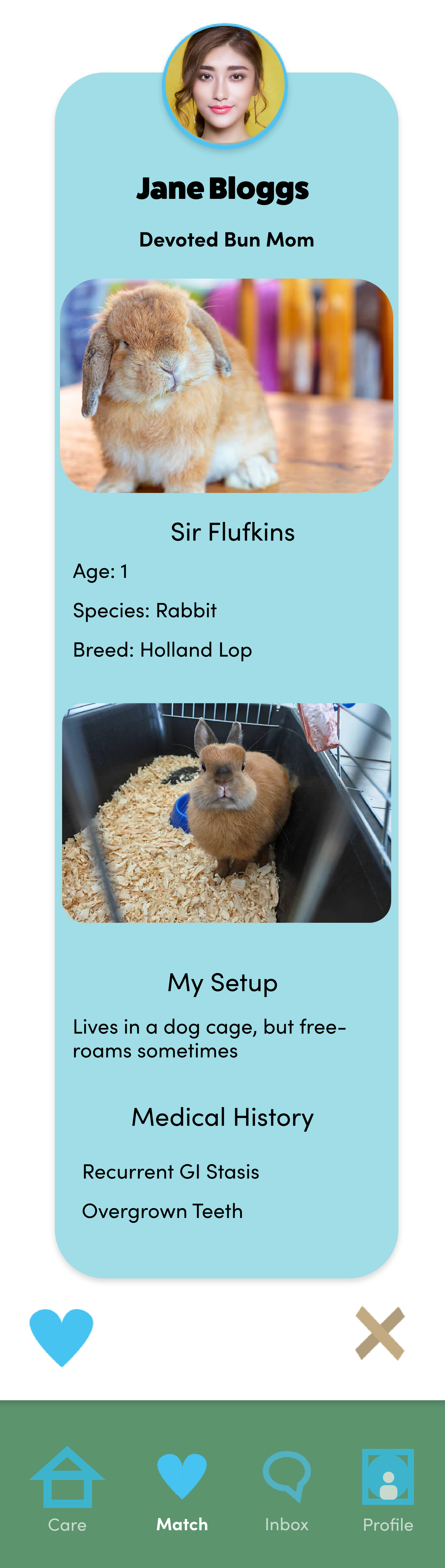 This is to help with creating connections between pet owners, specifically those that live in areas where resources may not be as accessible. Each profile focuses on giving a brief description of their pet’s medical information and housing set-up: the reason for this focus on the pets rather than the actual owners is that we want owners with similar experiences with their pets to be able to find each other. The algorithm for “matching owners” would also be based on pet species and medical history rather than other factors (i.e. proximity).