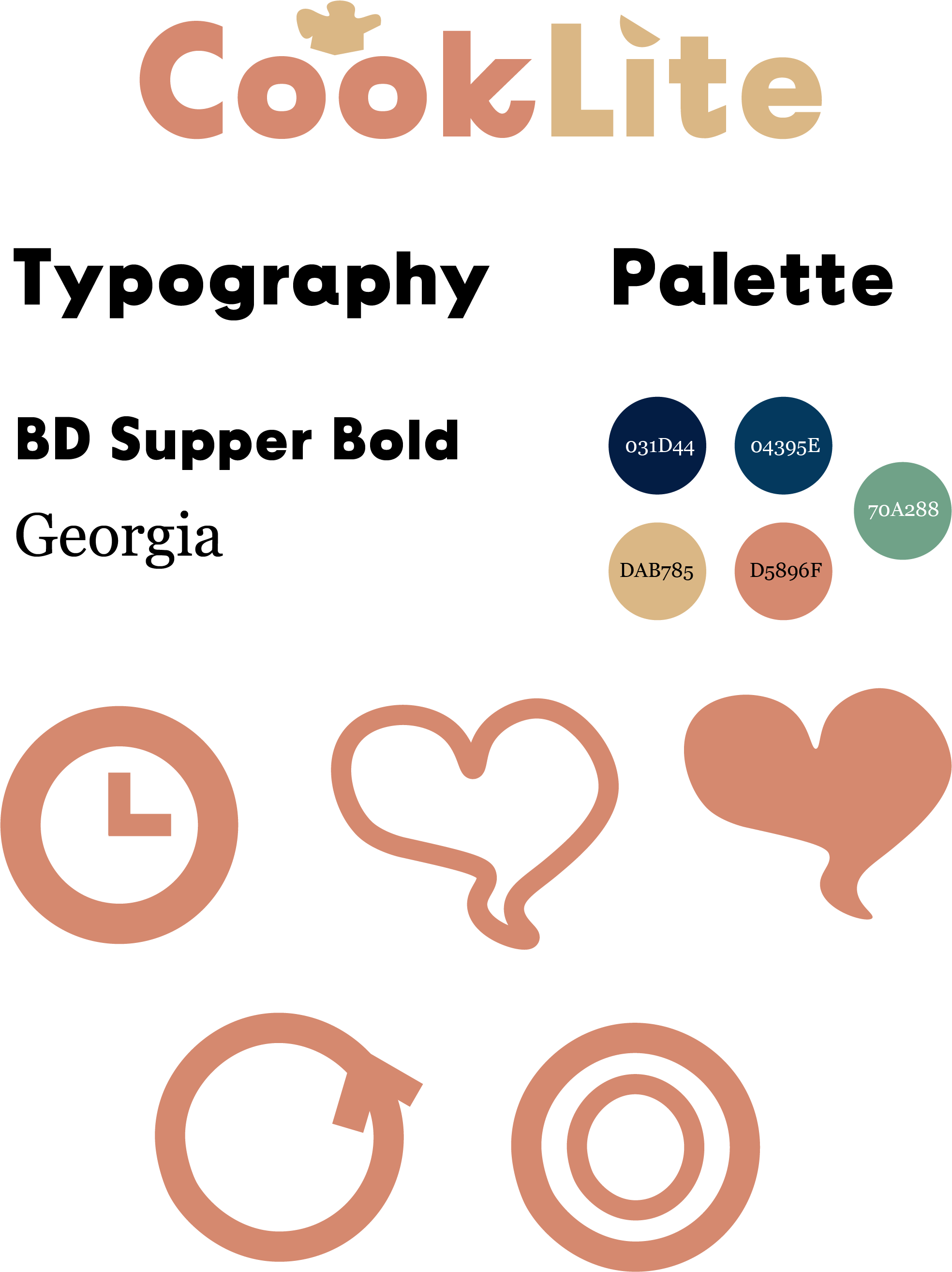 I wanted the palette to have a vibrant and lively feel because I wanted the interface to feel "fun" and encouraging for those who are trying to learn these recipes. BD Supper Bold as a heading font helped amplify this feeling.