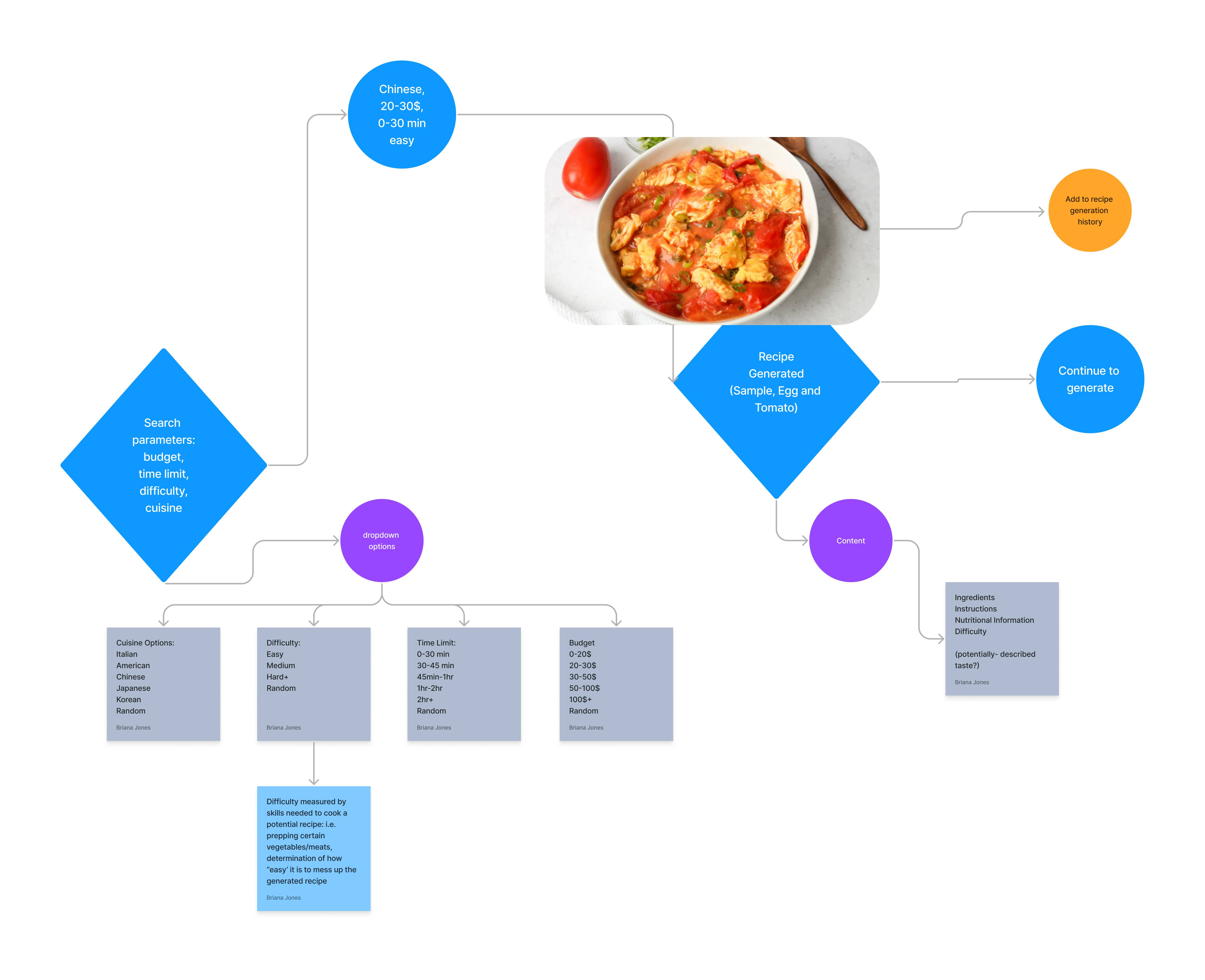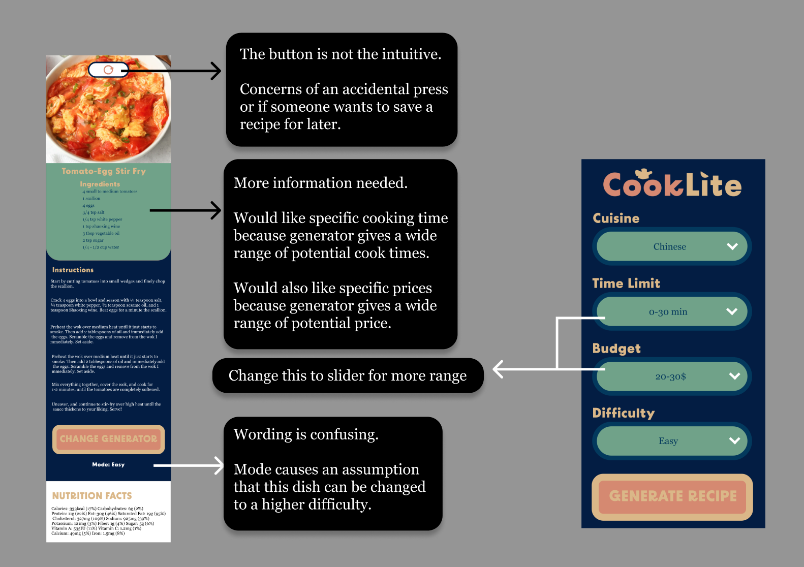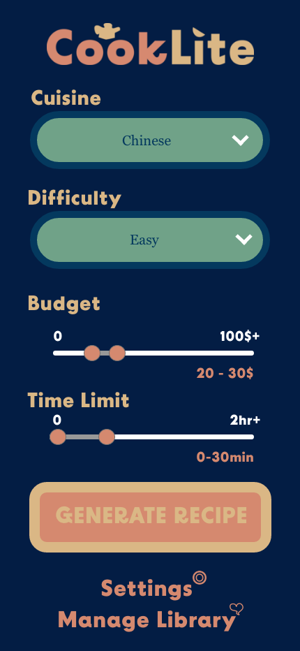 I decided to create four categories: cuisine, time limit, budget, and difficulty. Cuisine and difficulty helps narrow down what recipes the generator can provide for the user while time limit and budget takes into consideration what limitations a user may be under. I changed the interface based on suggestions and added sliders for a more personalized range.