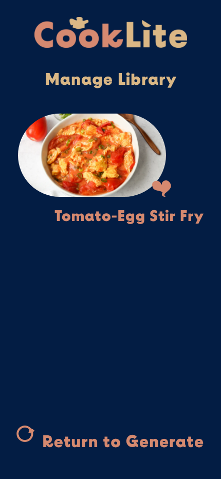 Additionally, I added a Library Manager to keep track of recipes that have been generated so a user can revisit them if they want to. This is much preferred over a recipe generation history tracker because it allows users to be more selective about what they want to potentially cook.