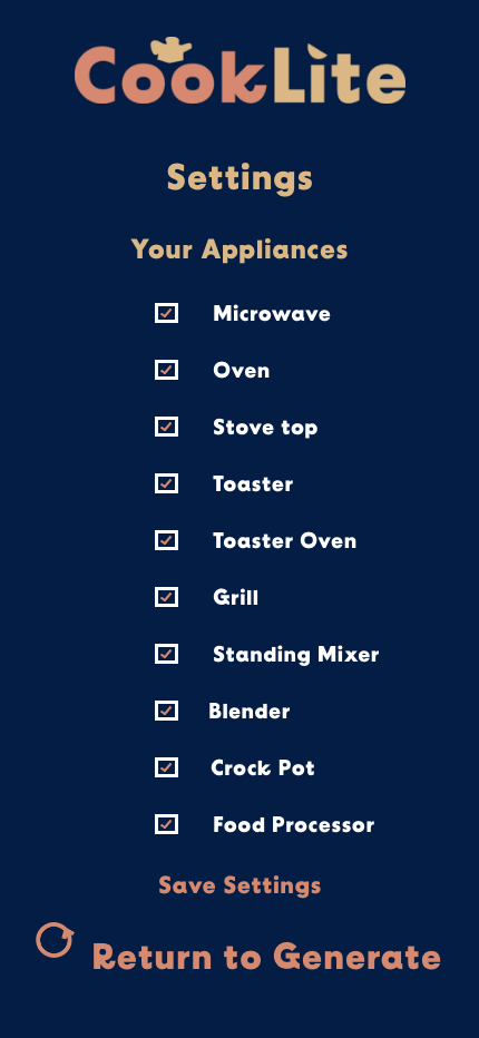 I also added the option to decide what sort of appliances that a recipe can use: this is to help users who may live in housing situations (like student dorms) where they are limited by what appliances are available to them.
