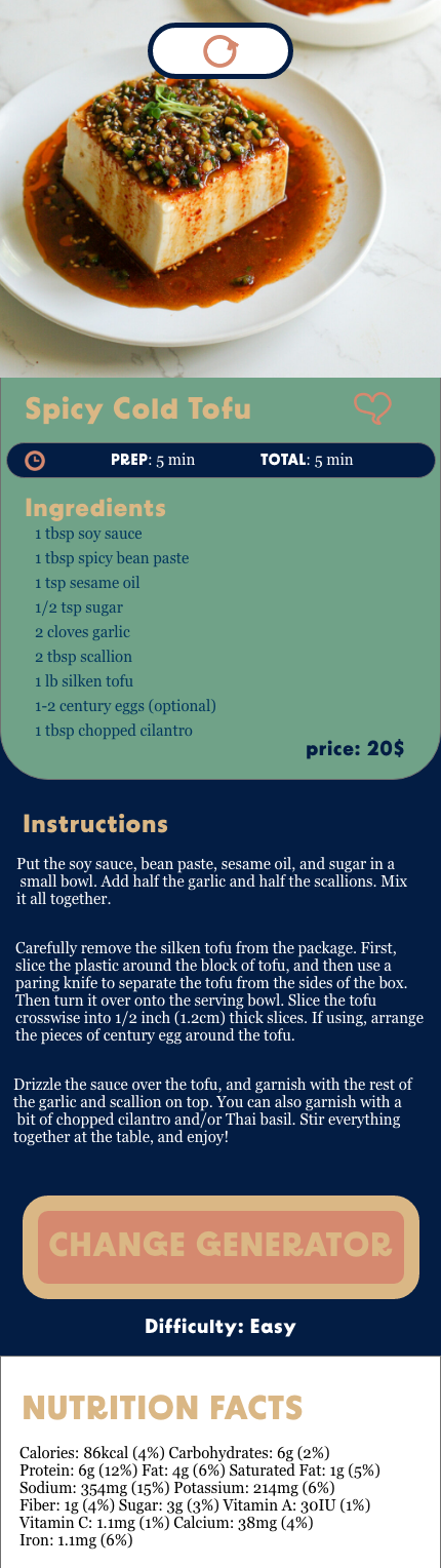 As someone who struggled to cook in college, I wanted to make a mockup for a potential recipe generator. I know fellow students in my program have suffered the same problems as me: not being able to cook because of budget and time constraints. Moreover, I know that it's difficult to even find the time/money to even learn how. I tried thinking of a creative way of addressing this, and I decided to think about how I could make cooking "fun" and accessible.