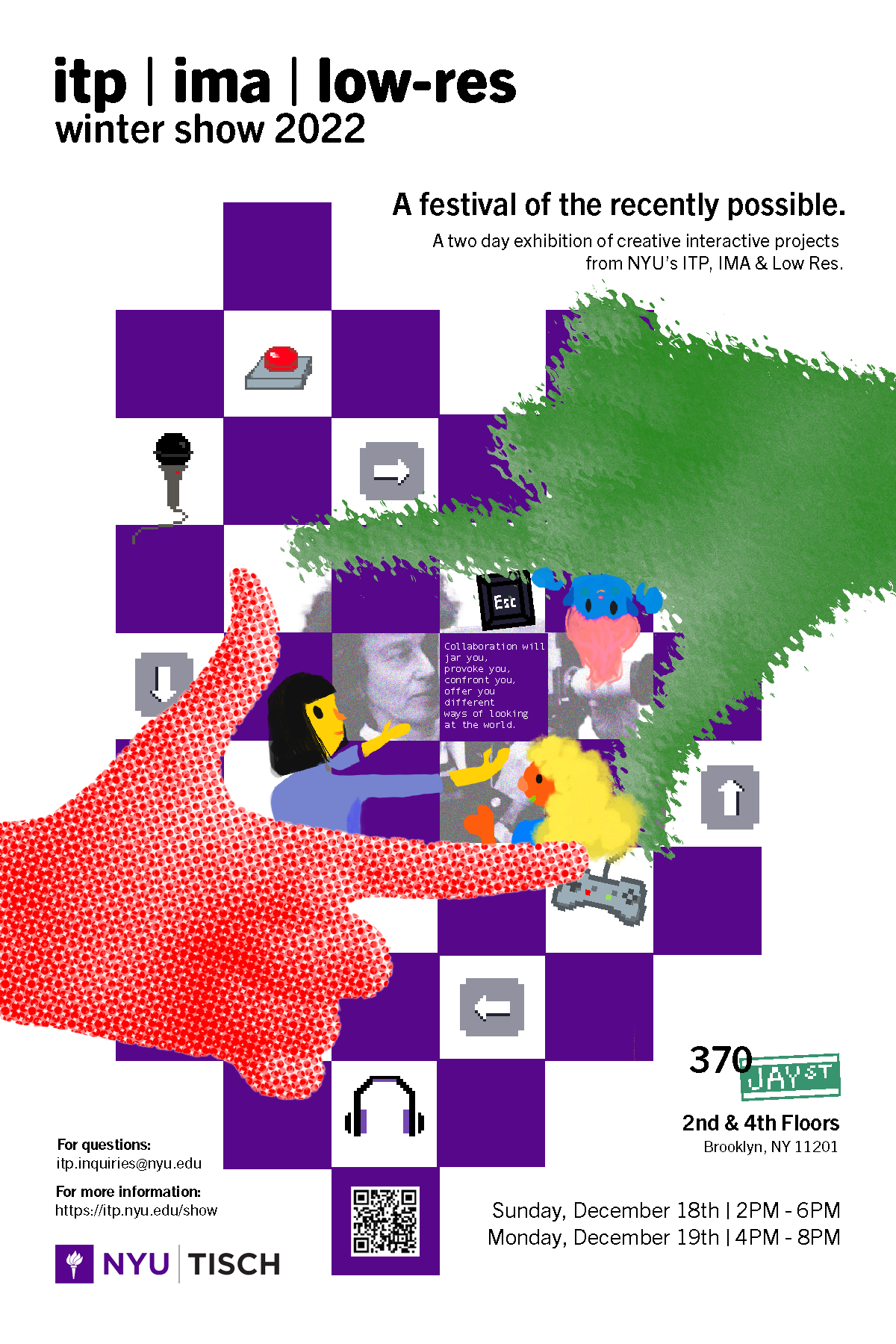 A poster that was created to represent ITP’s 2022 Winter Show. Aimed to represent topics like physicality, connectedness, shared space, and celebration. Focused on creating a more humanistic interpretation NYU’s ITP program.